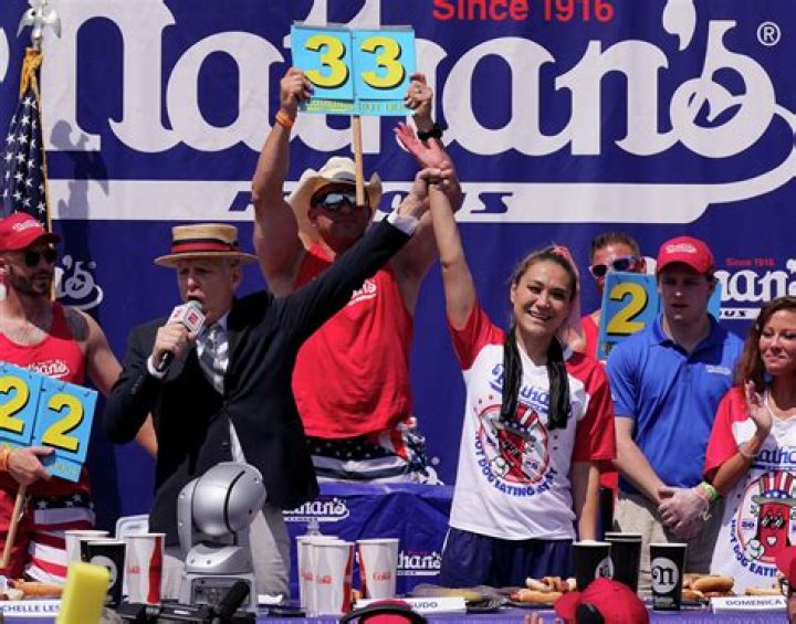 Miki Sudo has won the Nathan's Hot Dog Eating Contest four times and holds the world record for eating the most hot dogs in 10 minutes (48.5) and the most hamburgers in 10 minutes (23).